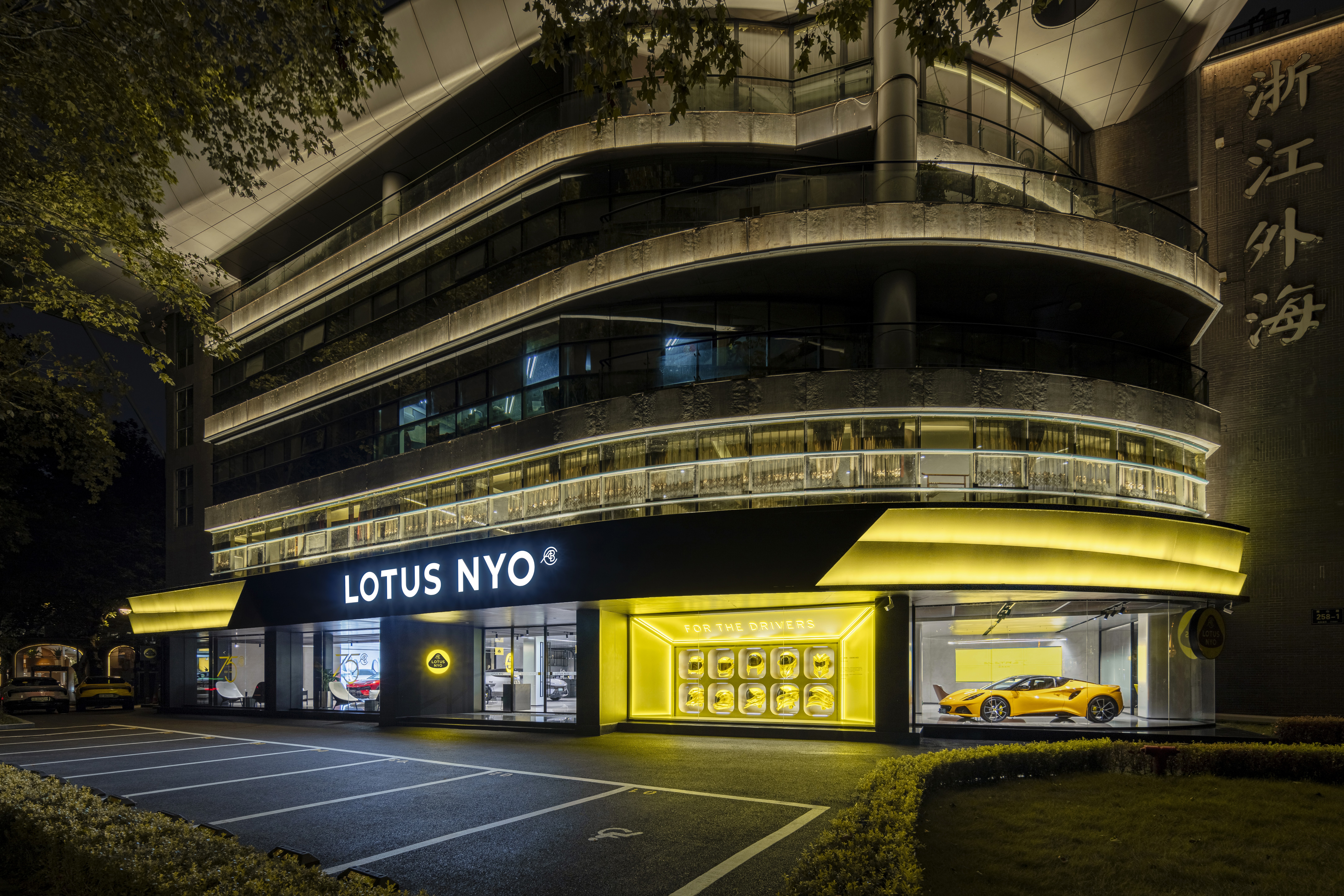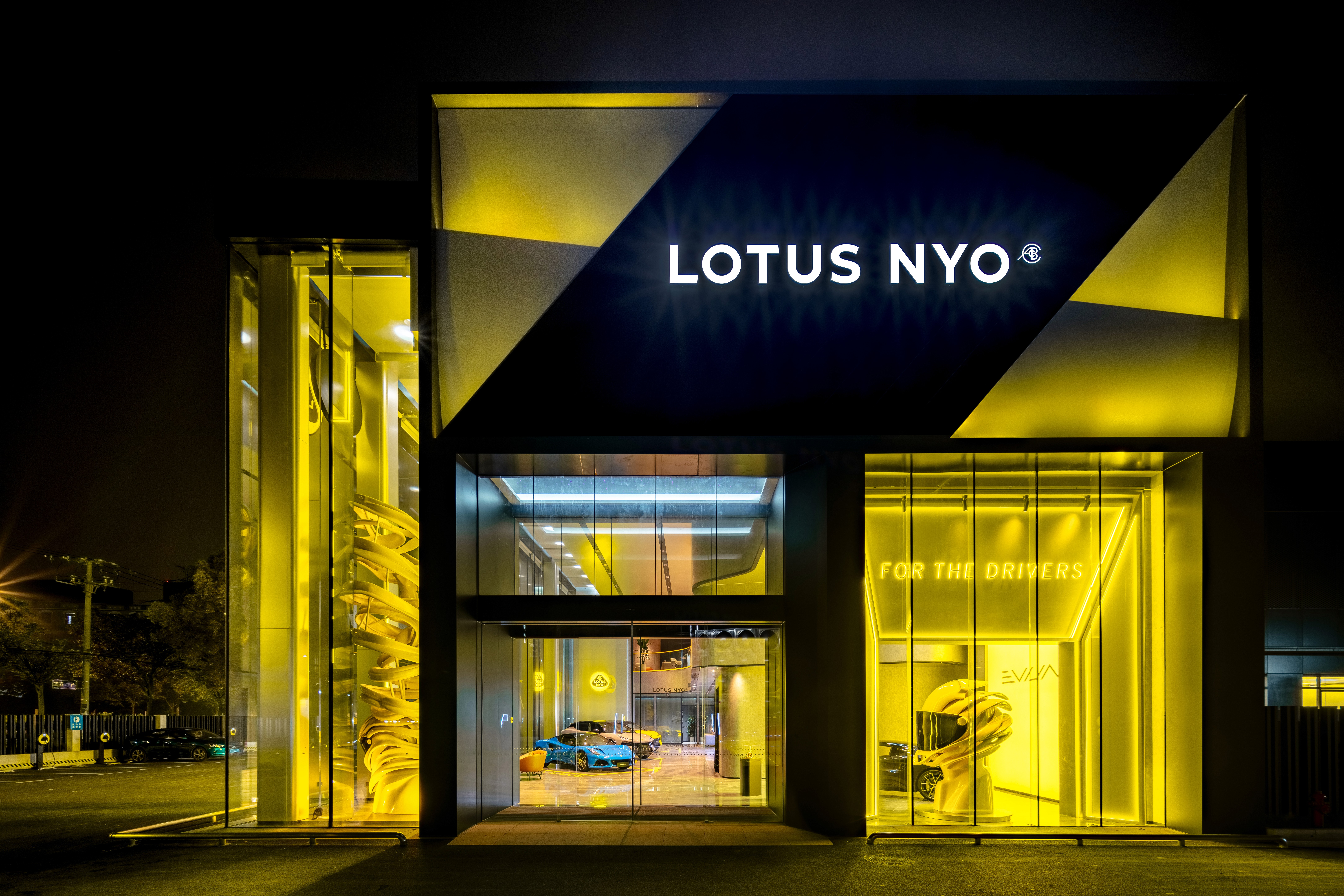 The facade design pays homage to Lotus founder Colin Chapman's relentless pursuit of aerodynamics. It incorporates elements from wind tunnel testing, such as guide vanes, and the streamlined shapes of Lotus car bodies into its architectural language. Layered geometric cuts and bevelled lines express Lotus's exclusive performance aesthetic of porous design. The brand's iconic yellow-and-black color scheme strengthens its identity with striking visual impact.